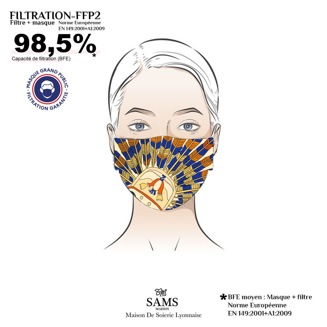 La maison Sams a décidé de renforcer la protection de ses masques en y ajoutant une ouverture à l’arrière pour y insérer un filtre PM2.5. L’utilisation du masque en soie, avec le filtre jetable correctement positionné confèrent une protection et une filtration équivalente à un masque FFP2 jetable.